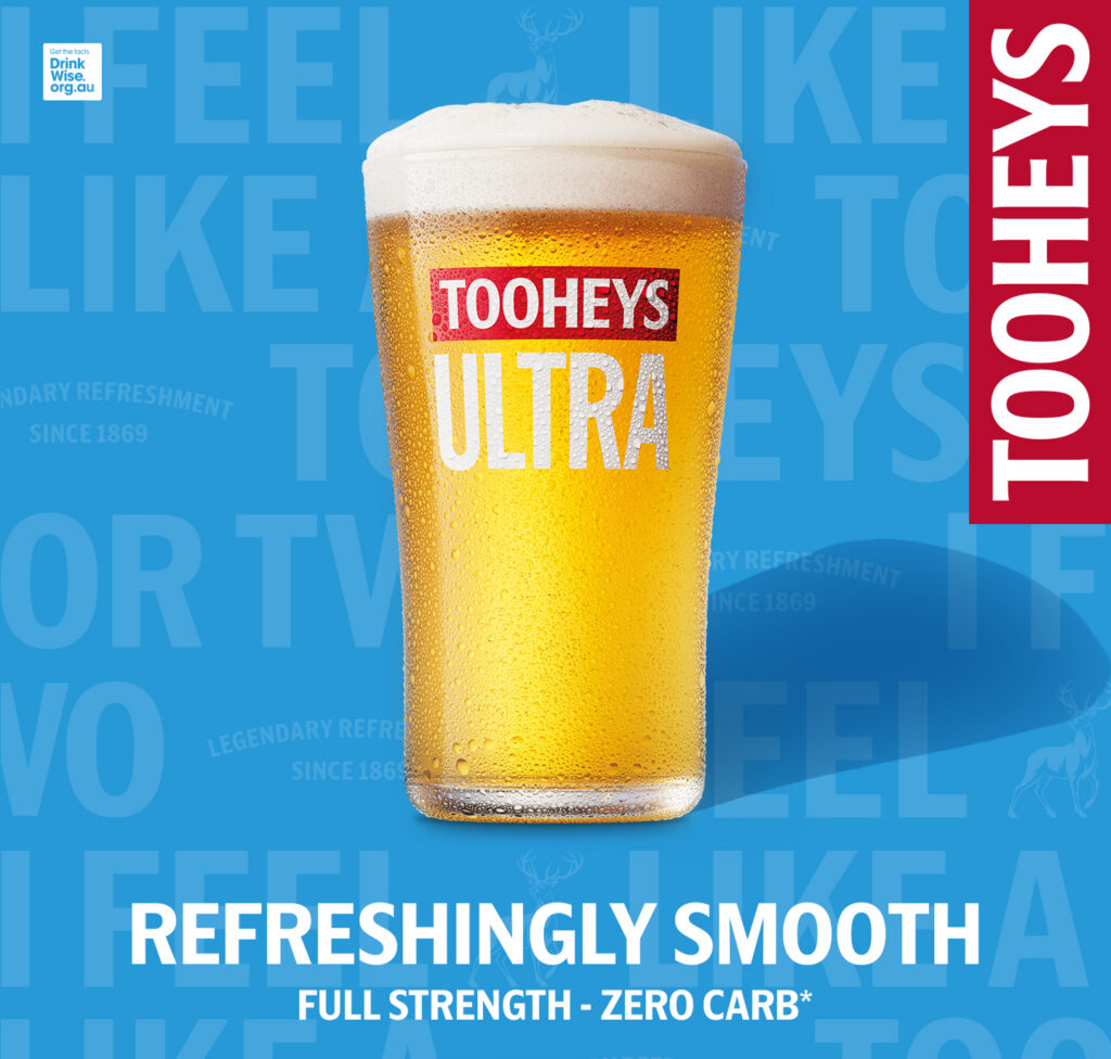 With fewer calories, zero carbs* and the same full-bodied taste, Tooheys Ultra Zero Carb* is a winning choice for the whole team.